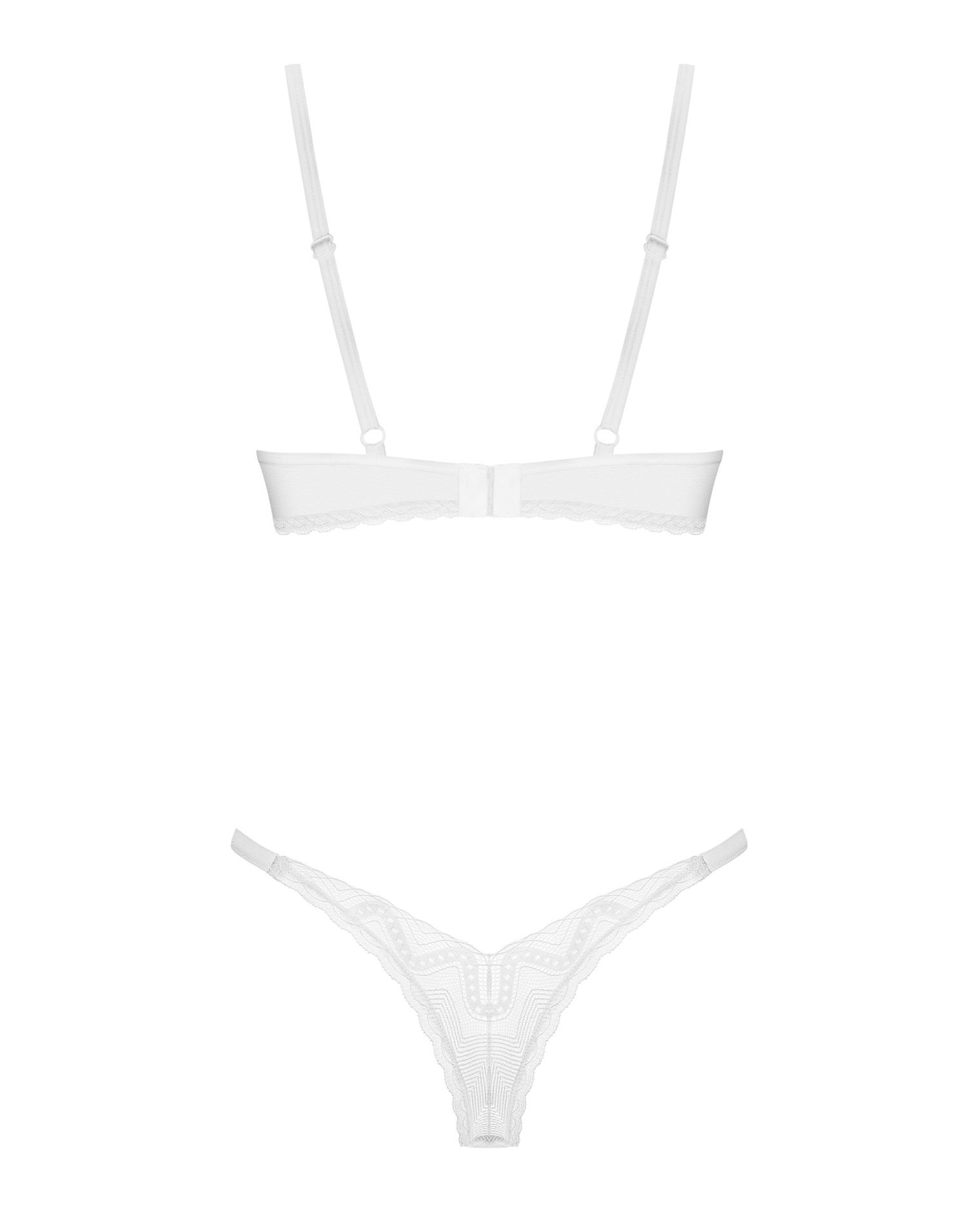 – zestaw składający się ze stringów oraz stanika w białym kolorze- miękkie miseczki z fiszbinami- regulowane ramiączka i kilkustopniowe zapięcie- koronka z geometrycznym wzorem- zawieszka w kolorze rose gold- 90% poliamid, 10% elastan- zaprojektowano w UE- nie zawiera niklu