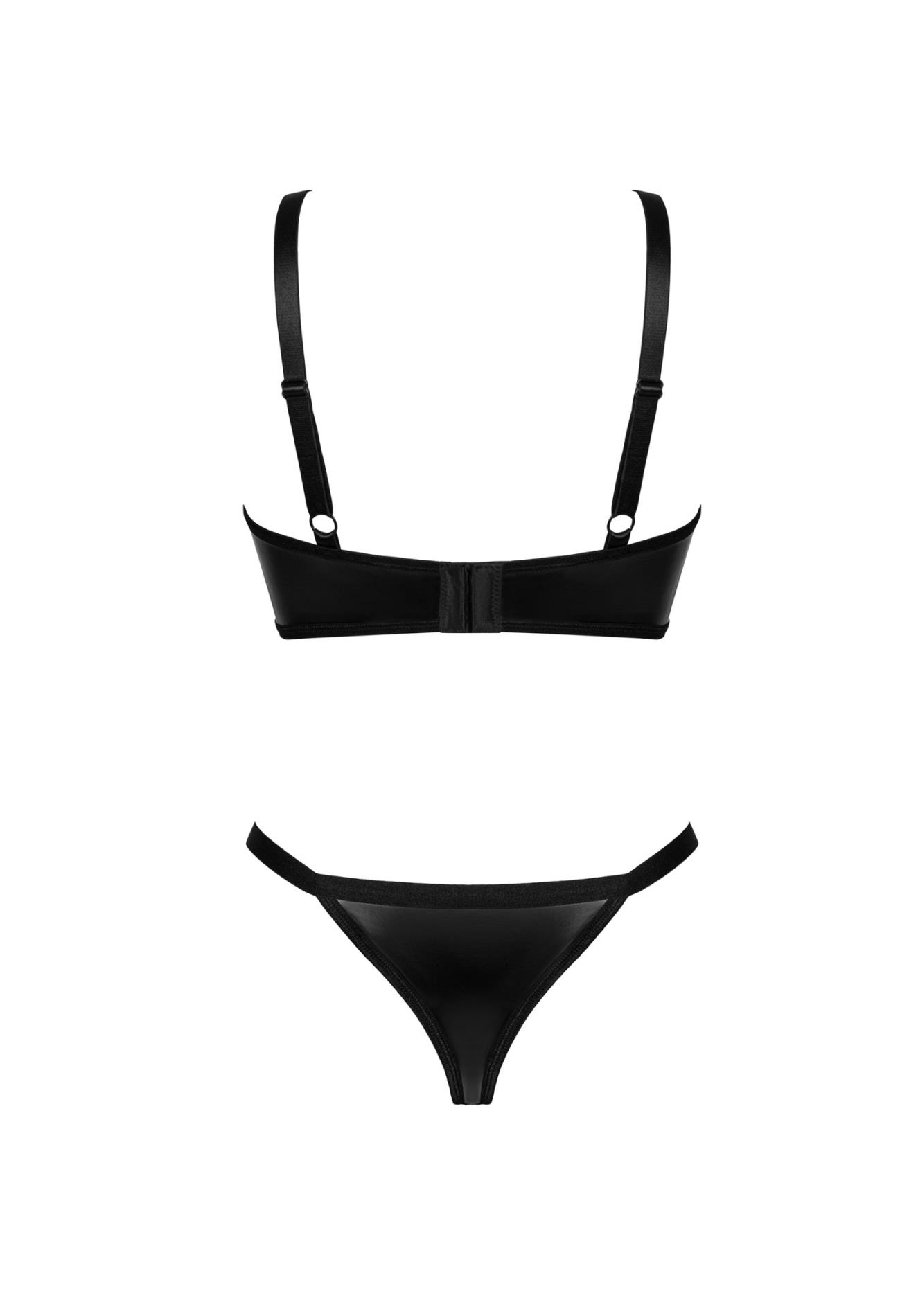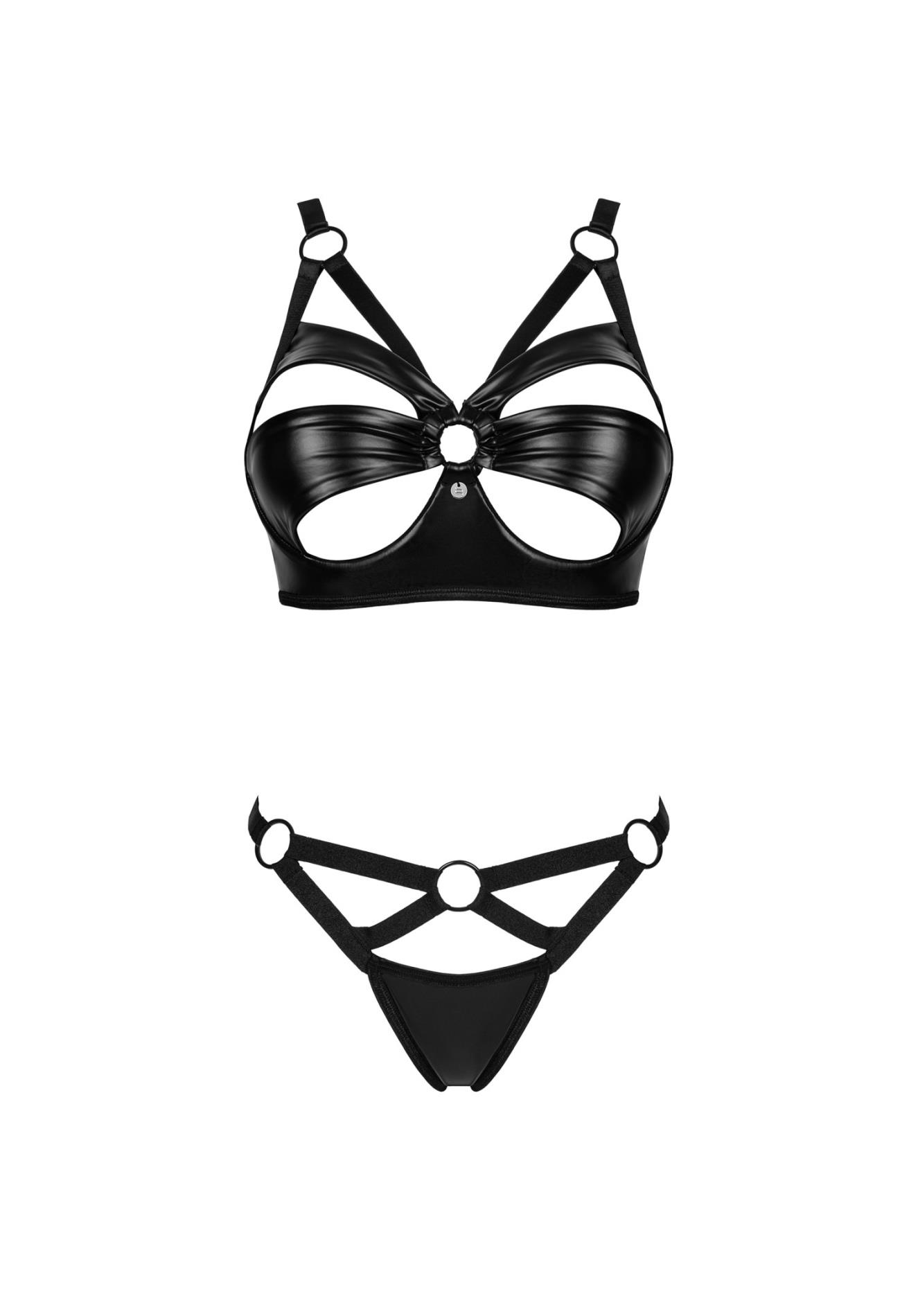Poznaj więcej szczegółów:- stringi i biustonosz w czarnym kolorze- znakomite dopasowanie dzięki fiszbinom w miseczkach, kilkustopniowemu zapięciu i regulowanym ramiączkom- metalowe detale i paski – przyciągają wzrok- gustowny detal w postaci srebrnej zawieszki- połyskujący materiał – zrobi wrażenie (100% poliuretan