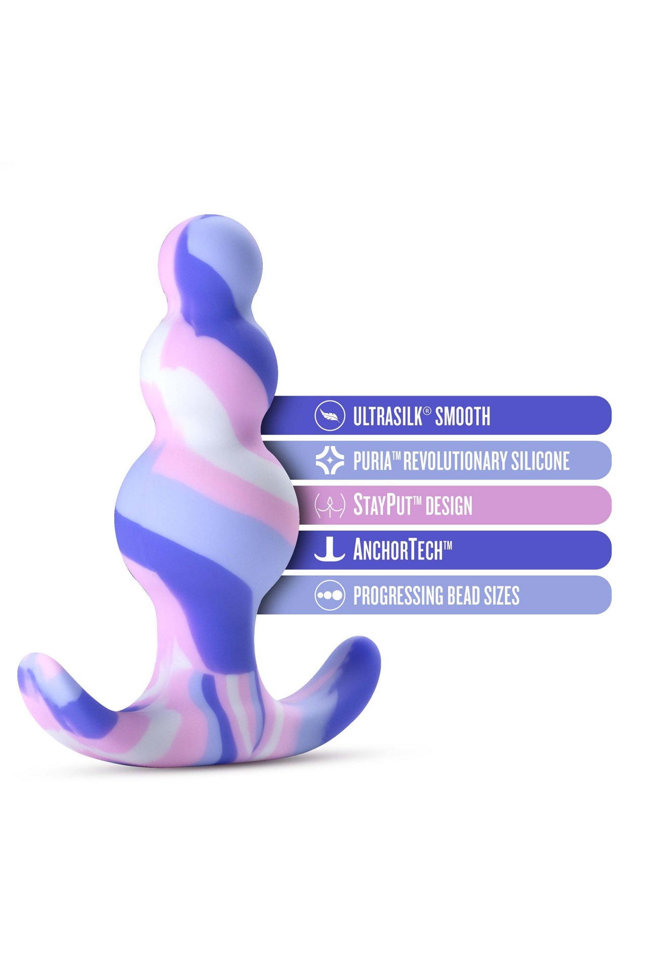 Twilight has a tapered head for easy insertion and three pleasure curves that progress in size for additional sensations during play, all with a beautiful, bright array of colors! Twilight is Ultrasilk ™ smooth and made of Puria™ platinum-cured silicone, making it body-safe, phthalate free, latex free, and fragrance free
