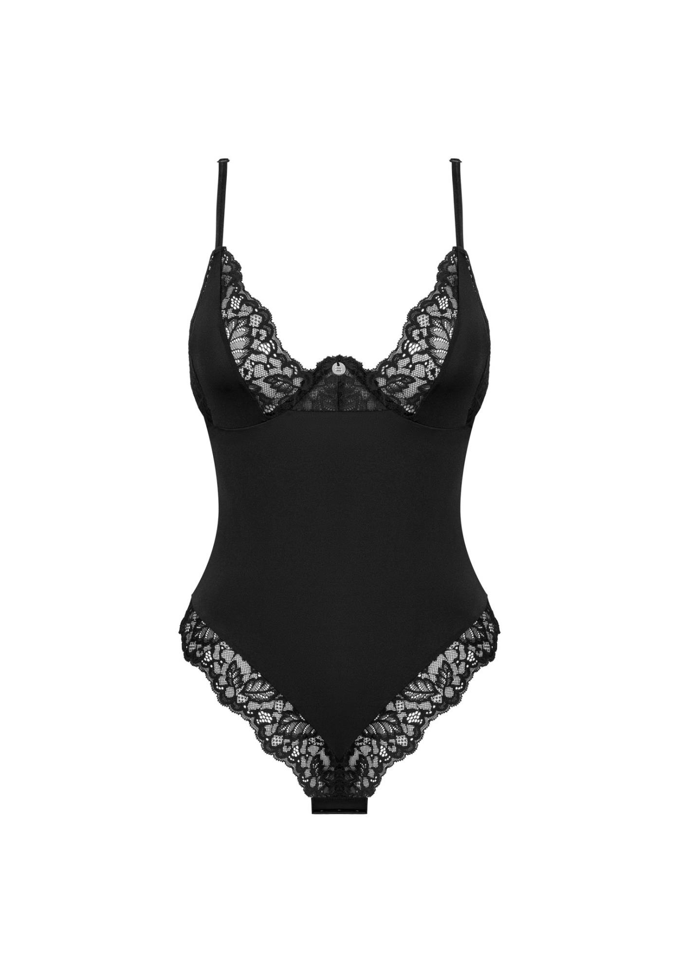 Poznaj więcej szczegółów:- zmysłowe czarne body- klasyczny krój eksponujący kobiece krągłości- znakomite dopasowanie dzięki regulowanym ramiączkom oraz kilkustopniowemu zapięciu- srebrna zawieszka – stylowy detal- regulowane zapięcie w kroku- fiszbiny idealnie podkreślające biust- koronka i elastyczny materiał – doskonałe połączenie (85% poliamid, 15% elastan)