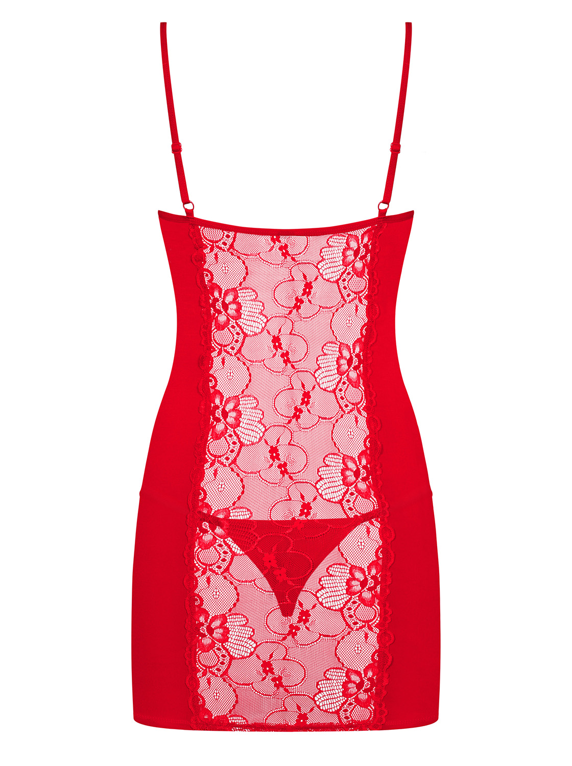Gładka tkanina i koronka pełna kwiatowych zdobień delikatnie otulające Twoje ciało, intensywna czerwień rozpalająca fantazje oraz połyskująca zawieszka idealnie wieńcząca całość