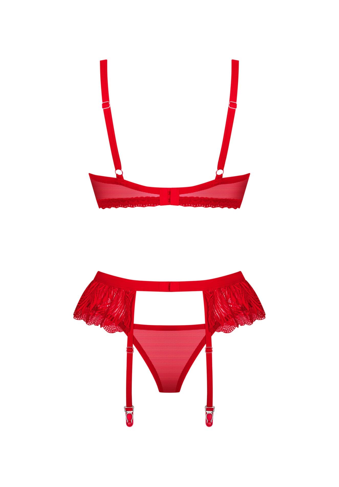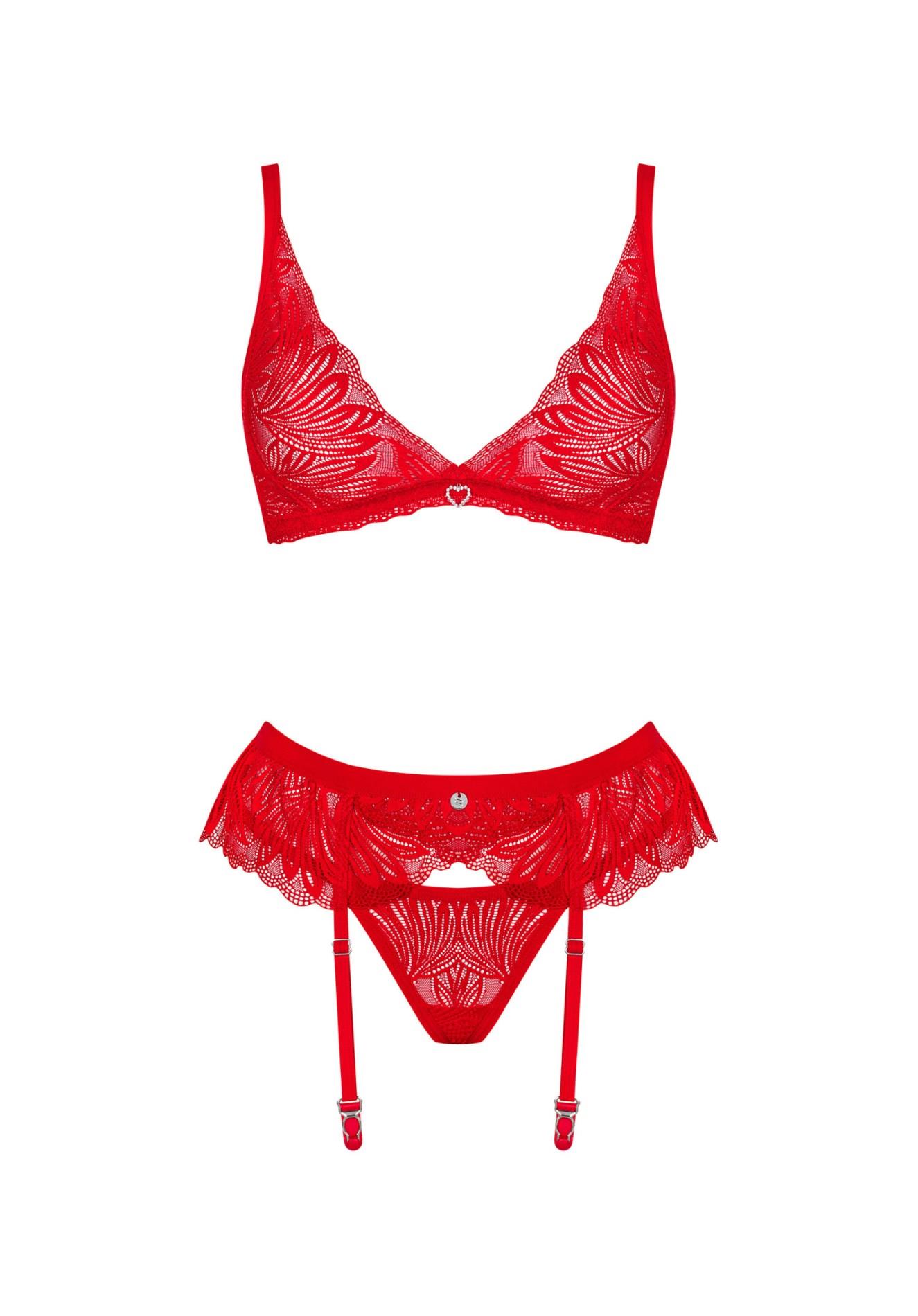 Poznaj więcej szczegółów:- zestaw czerwonej bielizny złożony z biustonosza, pasa do pończoch oraz stringów- regulowane ramiączka oraz kilkustopniowe zapięcie umożliwiają idealne dopasowanie- koronkowe wykończenia z oryginalnym wzorem- srebrne serduszko z cyrkoniami i połyskująca zawieszka – interesujące dodatki- miła w dotyku tkanina o wysokiej elastyczności (90% poliamid, 10% elastan)
