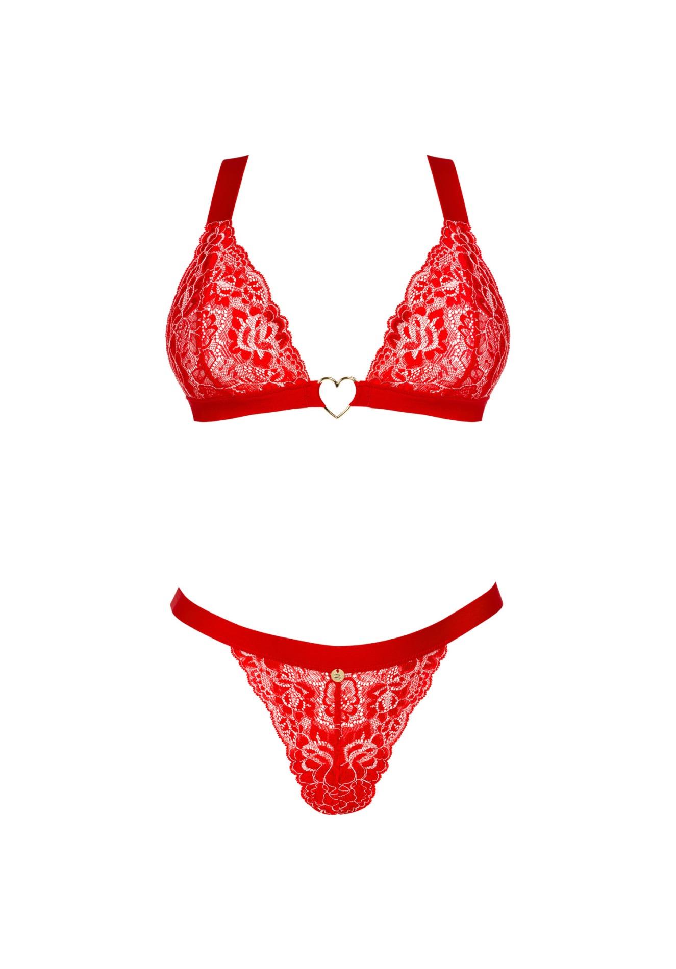 Poznaj więcej szczegółów:- komplet w czerwonym kolorze – stringi i biustonosz- możliwe znakomite dopasowanie dzięki regulowanym ramiączkom oraz kilkustopniowemu zapięciu- uwodzicielskie koronkowe wykończenia- metalowy łącznik w kształcie złotego serca – intrygujący detal- błyszcząca zawieszka – subtelny dodatek- przyjemny w dotyku materiał – zapewnia poczucie komfortu (90% poliamid, 10% elastan)