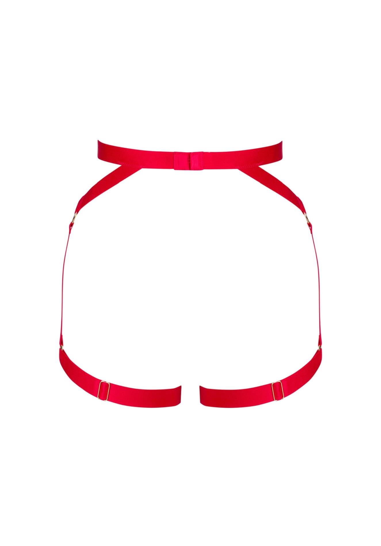 Zaprojektowana z pasków w kolorze intensywnej czerwieni uprząż zachwyca designem oraz intrygującymi detalami