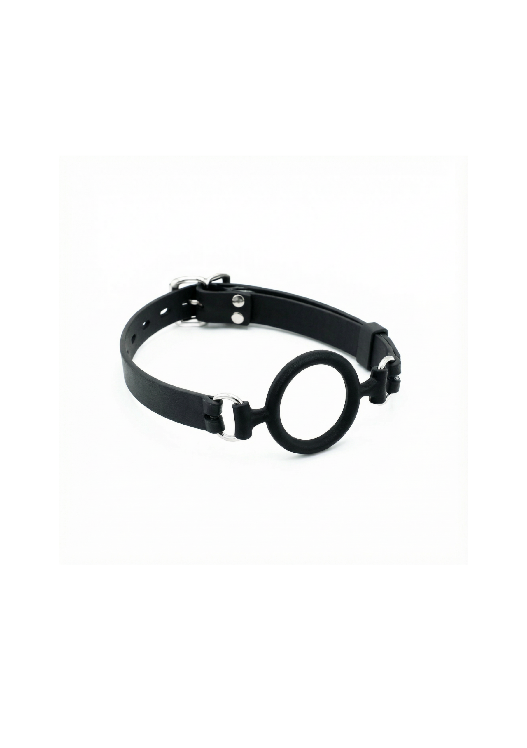 Czarny knebel w kształcie pierścienia na regulowanym pasku. Pierścień nie jest elastyczny i dlatego służy jako knebel do ust, średnica˜ 5 cm. Materiał: silikon.