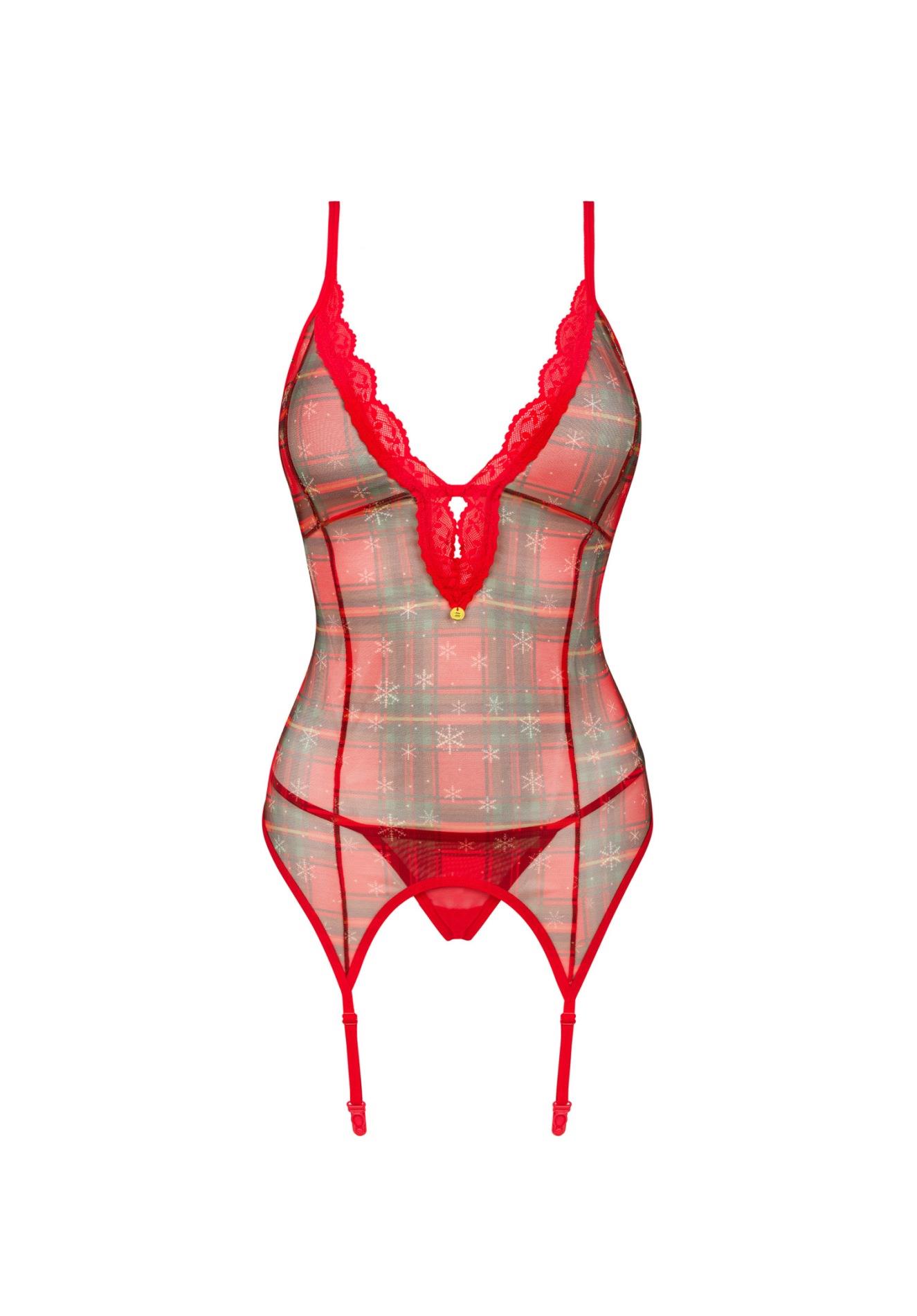 Poznaj więcej szczegółów:- gorset ze świątecznym motywem i stringi w kolorze czerwieni- koronka przy dekolcie – przyciąga wzrok- regulowane paski do pończoch – możliwość idealnego dopasowania- złota zawieszka – elegancki detal- elastyczny materiał – jak druga skóra! (90% poliamid, 10% elastan)