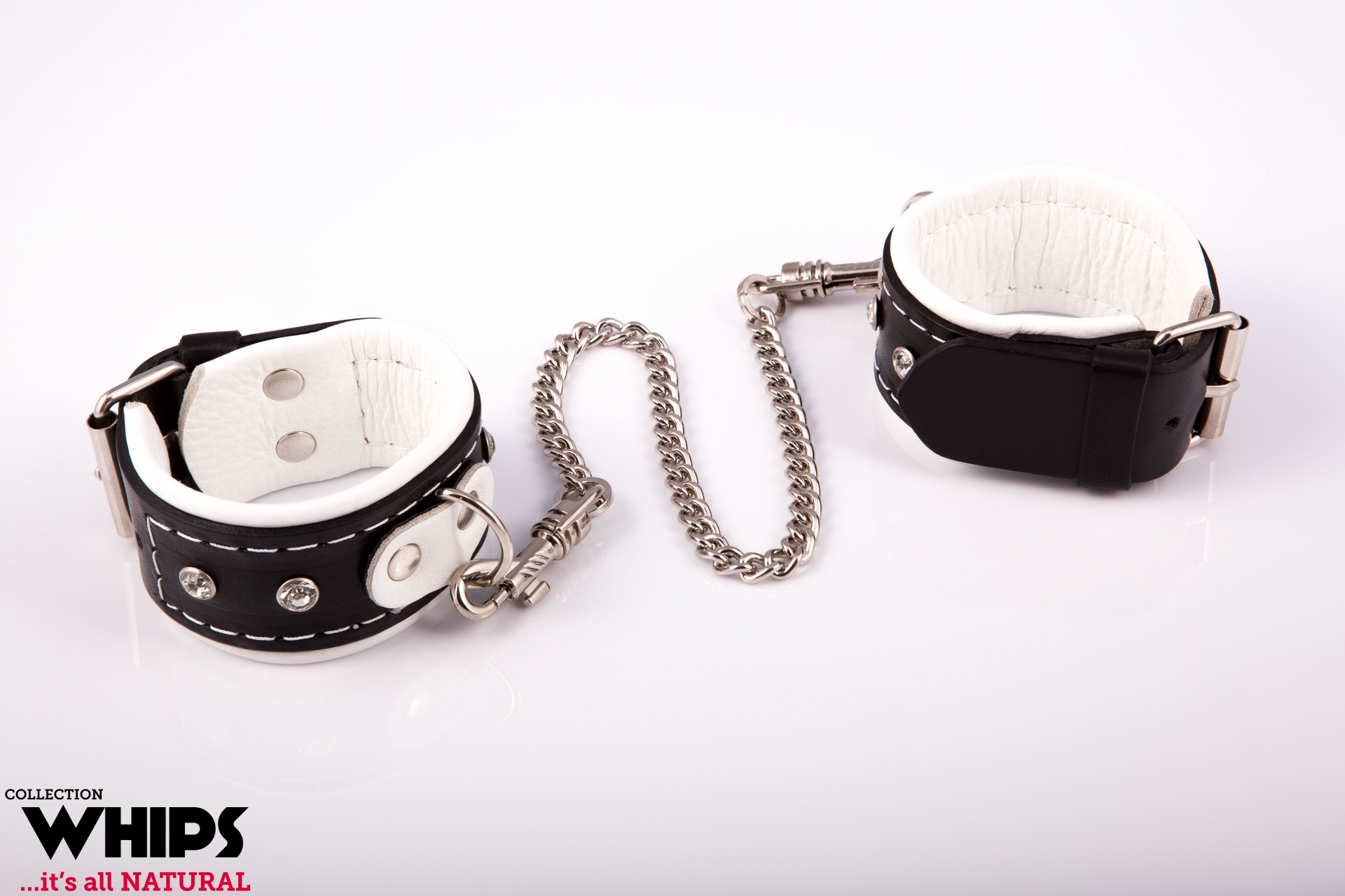 Skórzane kajdanki w kolorze biało-czarnym zapinane na masywne klamry