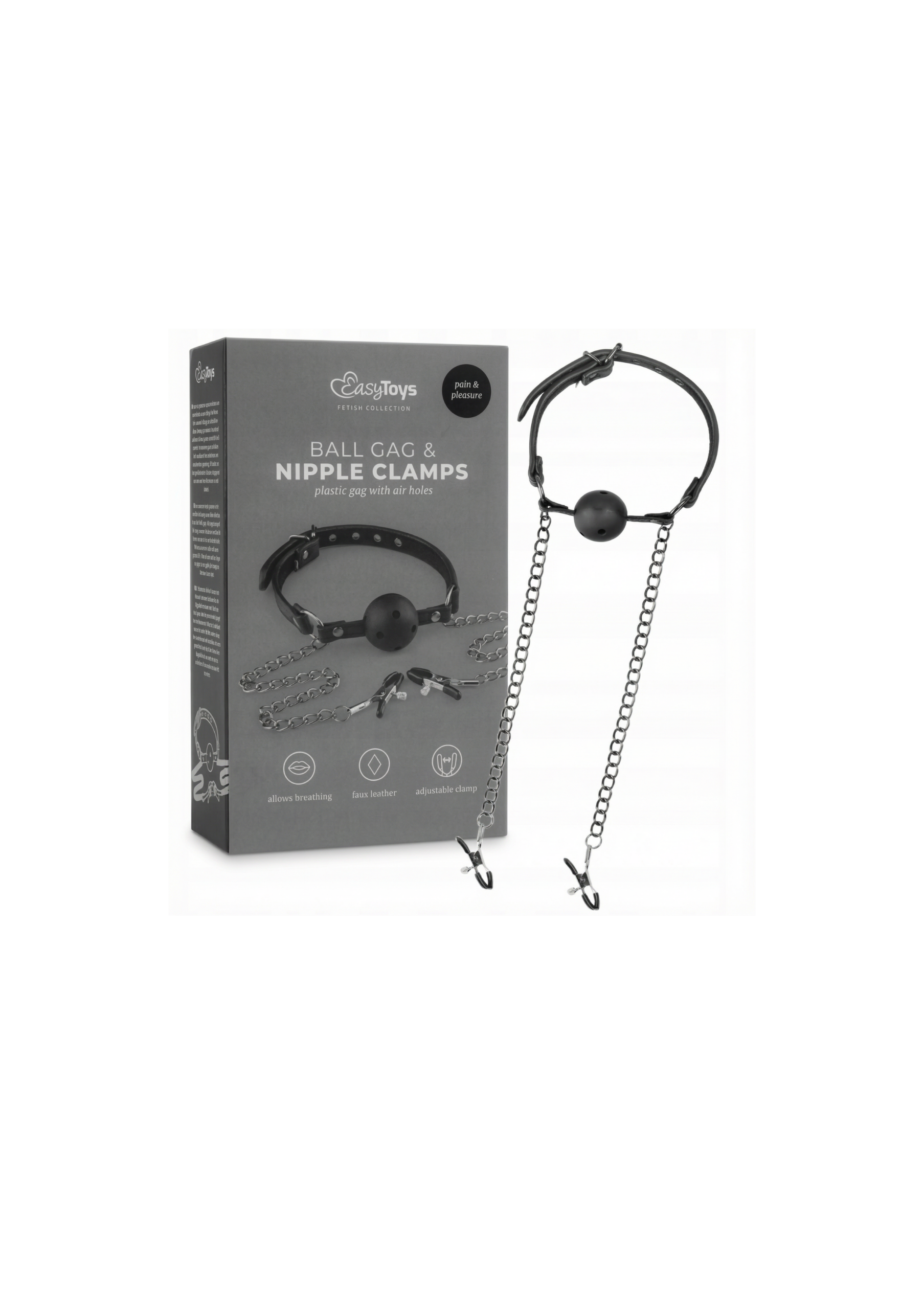 Knebel z zaciskami na sutki z EasyToys Fetish Collection. Ten czarny kulkowy knebel jest wykonany z gładkiego plastiku z otworami wentylacyjnymi. Piłka jest bezwonna i pozbawiona smaku, więc użytkownik może cieszyć się kulkowym gagiem bez obaw. Pasek na głowę ze sztucznej skóry jest regulowany, aby zapewnić idealne dopasowanie. Zaciski na sutki z łańcuchami przymocowanymi do paska. Zaciski są regulowane za pomocą śrub po bokach. Średnica kulki: 4,3 cm