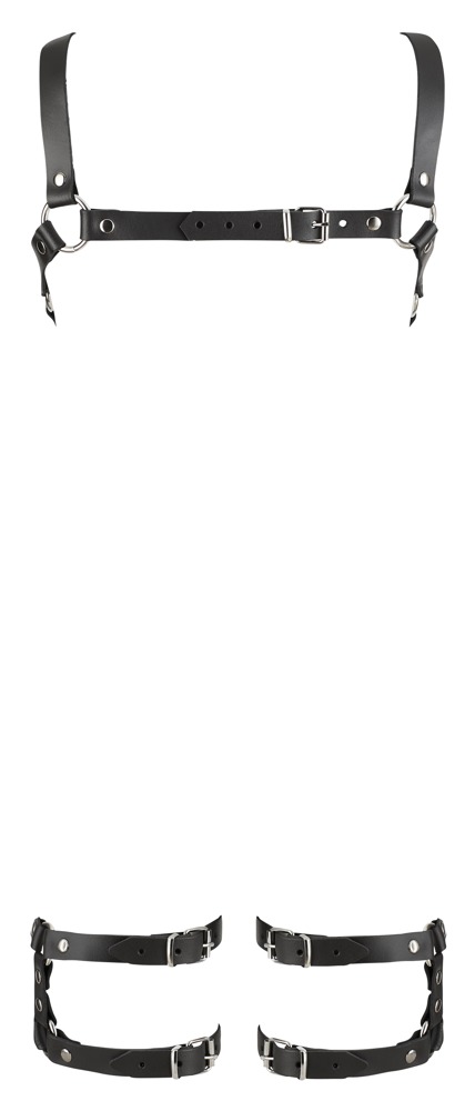 Idealny do gorących zabaw w bondage!Szelki na klatce piersiowej z odpinanymi mankietami na udach otwierają się za pomocą prostego zapięcia karabińczykowego