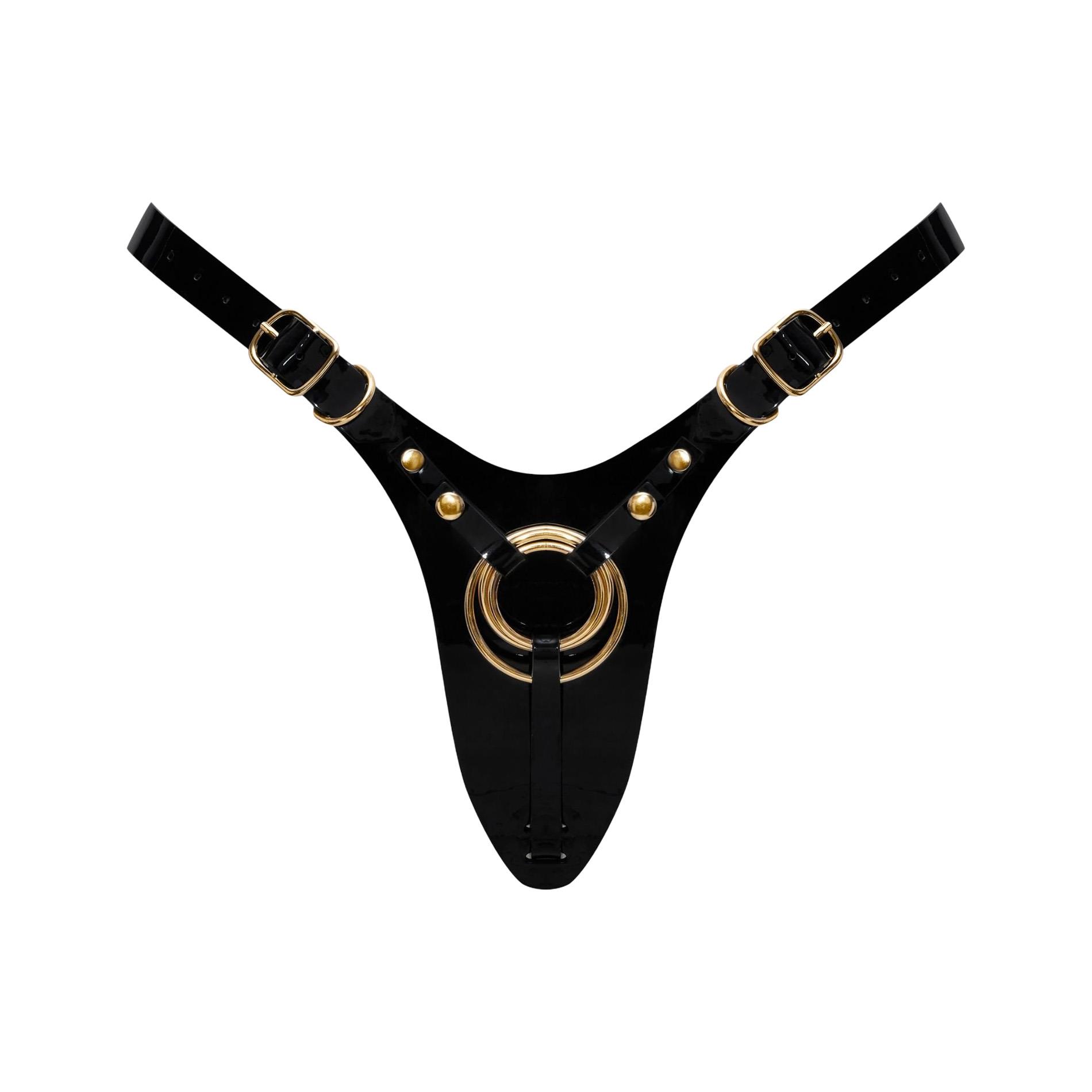 Inspirowana klasycznymi stringami, ta uprząż została zaprojektowana jak biżuteria na ciało – z błyszczącym wykończeniem w stylu „patent” i minimalistycznym krojem, który eksponuje pośladki z niezwykłą finezją.