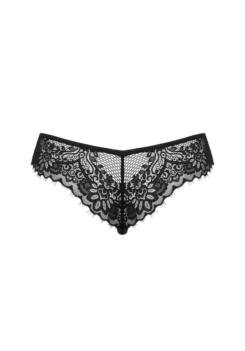 Jeśli szukasz bielizny, która doda Ci pewności siebie, to musisz mieć te niebanalne figi w swojej szafie!Poznaj więcej szczegółów:- koronkowe figi w czarnym kolorze- seksowny krój podkreślający pośladki- srebrna zawieszka – ciekawy dodatek- miły w dotyku materiał – gwarancja wygody (90% poliamid, 10% elastan)