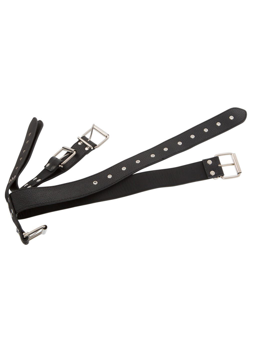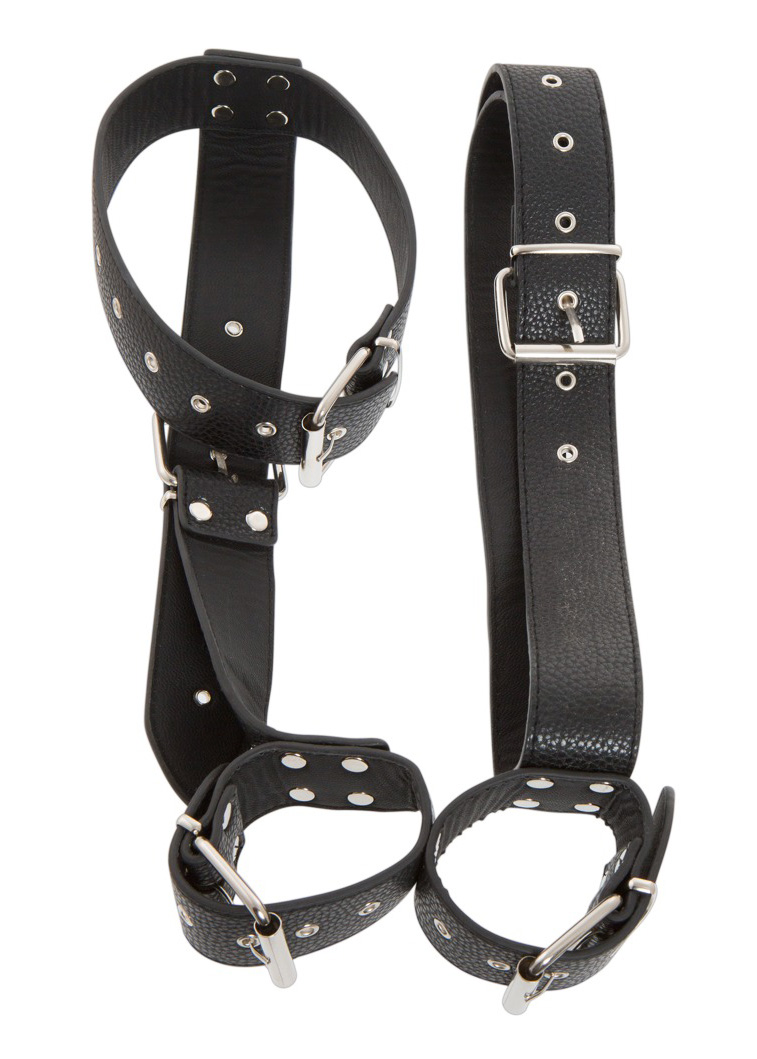 Skuteczne kajdanki na ciało od Bad Kitty!Solidna konstrukcja wykonana z czarnej imitacji skóry: mankiet na szyję i pas biodrowy połączone mocnym, nitowanym paskiem tylnym, do którego przymocowane są kajdanki jedna nad drugą