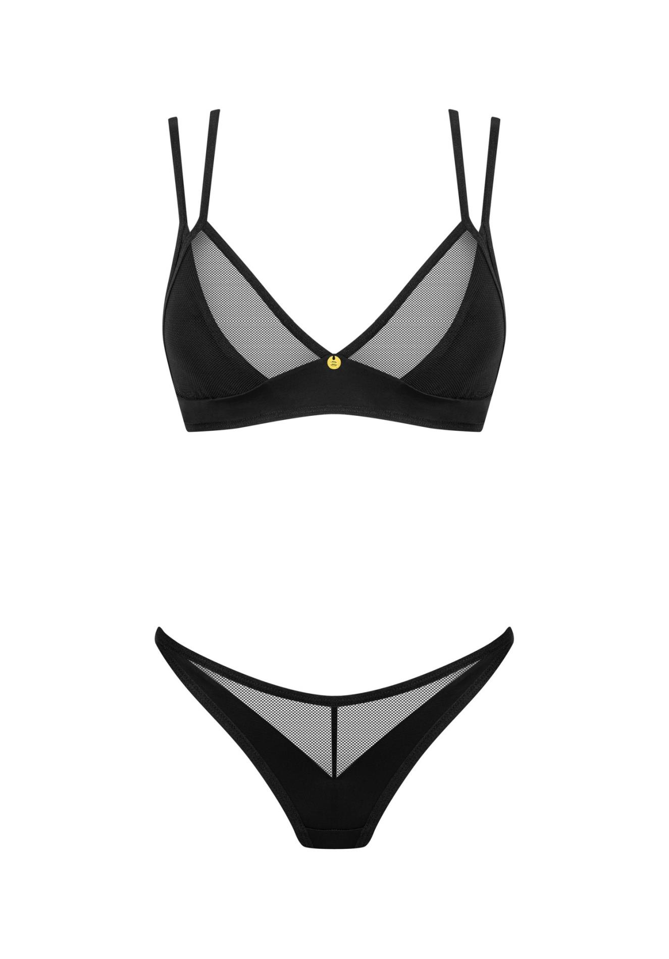 Czuj się atrakcyjnie, gdziekolwiek jesteś!Poznaj więcej szczegółów:- czarne stringi oraz biustonosz- o idealne dopasowanie zadbają kilkustopniowe zapięcie i regulowane ramiączka- zmysłowo zestawione materiały- zawieszka w złotym kolorze – połyskujący detal- wygodny materiał – przyjemny w dotyku (85% poliamid, 15% elastan)