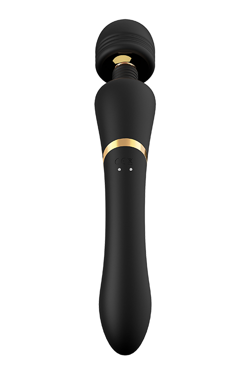 Stymulator różdżki Monica z kolekcji Prestige od Dream Toys to czarna różdżka ze stylowymi złotymi akcentami, guzikiem w kształcie klejnotu, mocnym, solidnym uchwytem, ??zaokrągloną główką i elastyczną szyjką