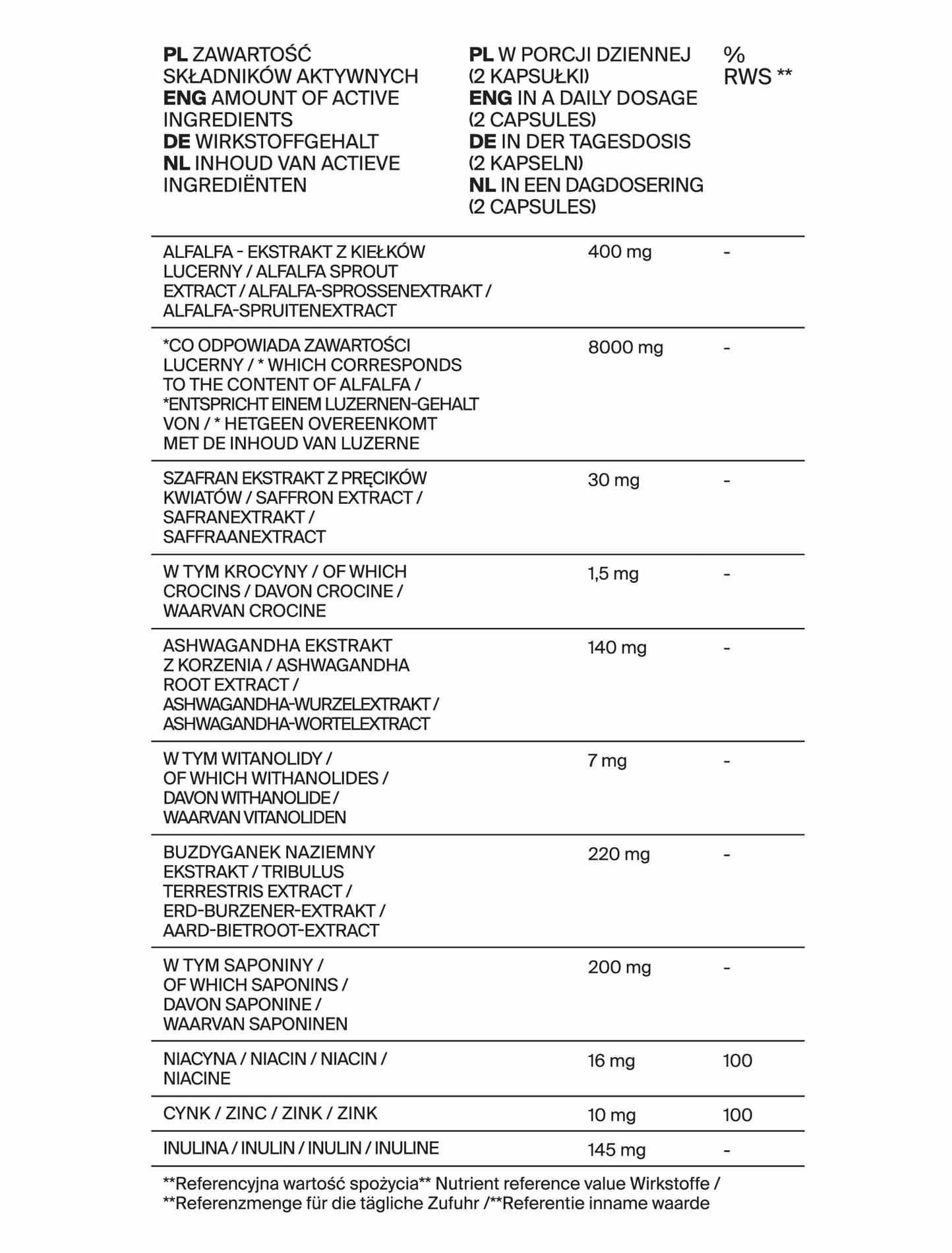 Składniki: ekstrakt z kiełków lucerny siewnej (Medicago sativa) DER 20:1, ekstrakt z ziela buzdyganka naziemnego (Tribulus terrestris), kapsułka celulozowa, inulina z cykorii, ekstrakt z korzenia witanii ospałej – Aswaghandhy KSM-66 (Withania somnifera), pikolinian cynku, ekstrakt z pręcików kwiatu szafranu (Crocus sativa), kwas nikotynowy.