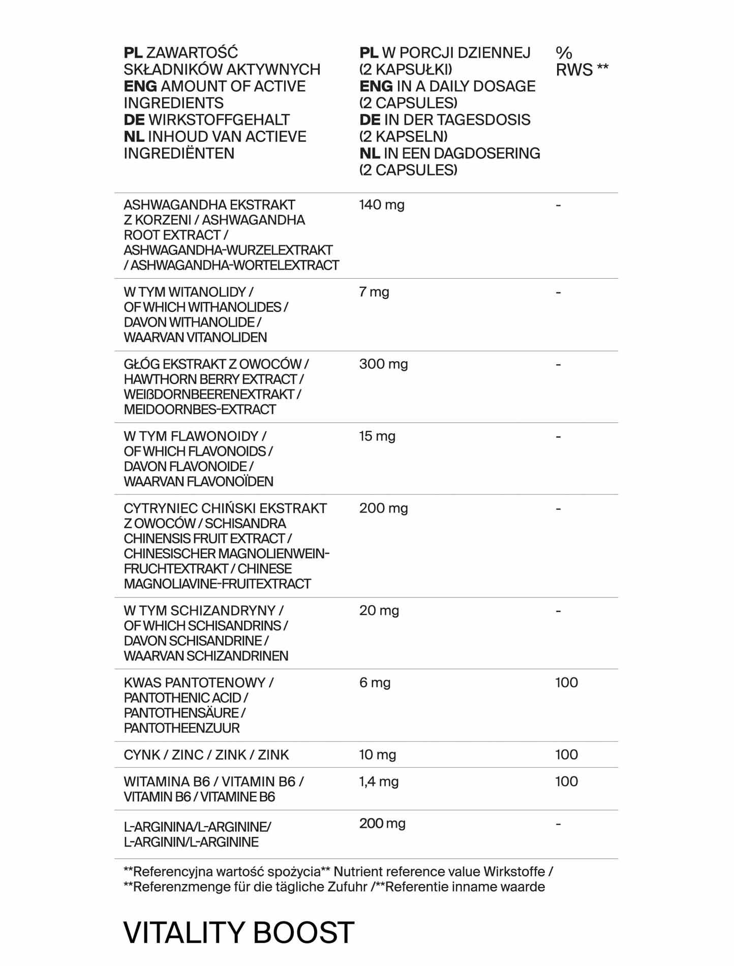 Składniki: ekstrakt z owoców głogu (Crataegus oxyacantha), L-arginina, ekstrakt z owoców cytryńca chińskiego (Schisandra chinensis), kapsułka celulozowa, ekstrakt z korzenia witanii ospałej – Aswaghandhy KSM-66 (Withania somnifera), inulina z cykorii, pikolinian cynku, chlorowodorek pirydoksyny.