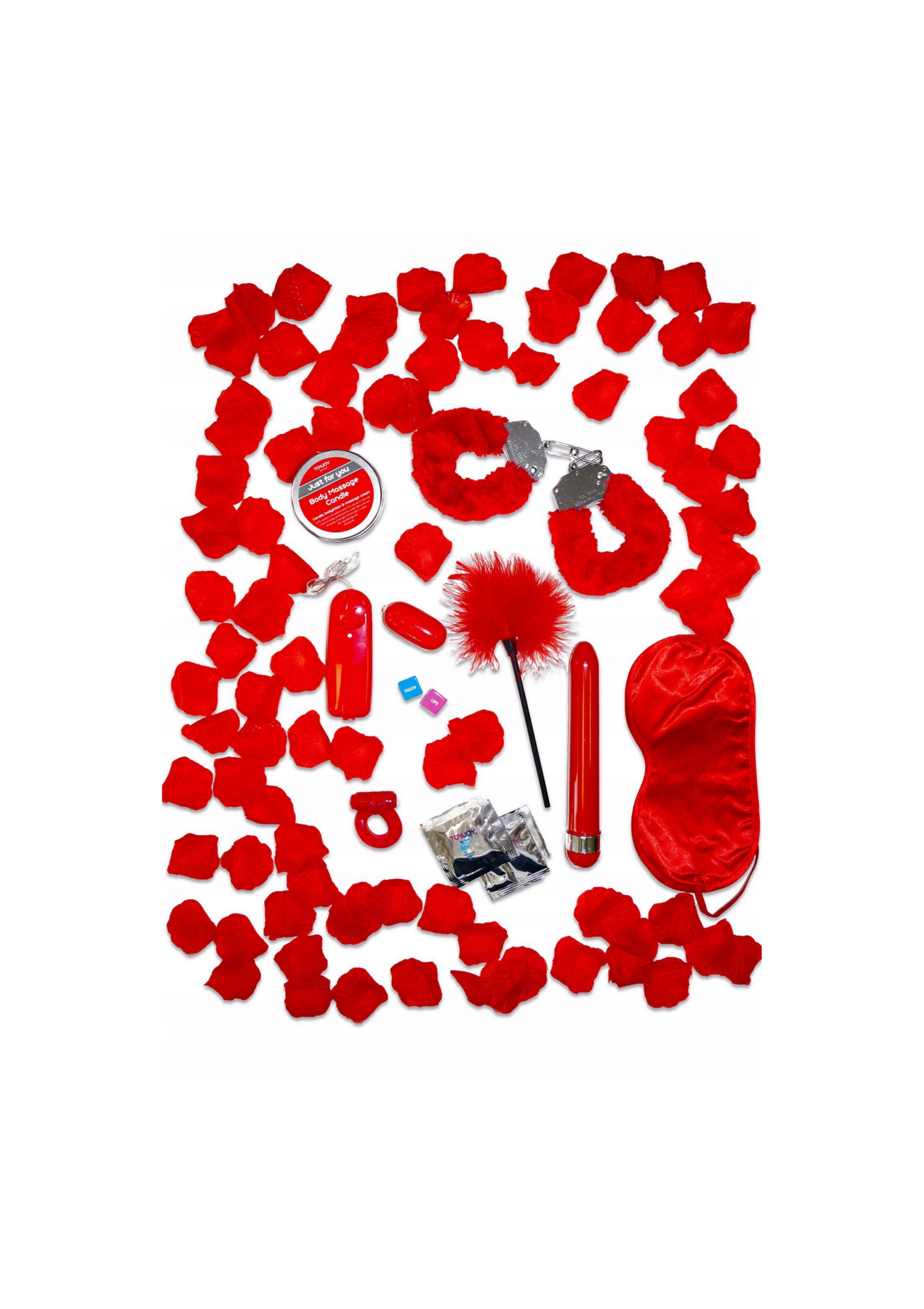 Kuszący zestaw zawiera drażniące mankiety na nadgarstki, wibrator, wibrujące jajko, łaskotkę z piór, maskę na oczy, jednorazowy wibrujący pierścień na penisa, świecę do masażu, lubrykant i odrobinę płatków róż