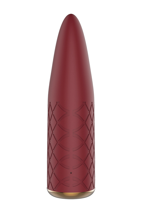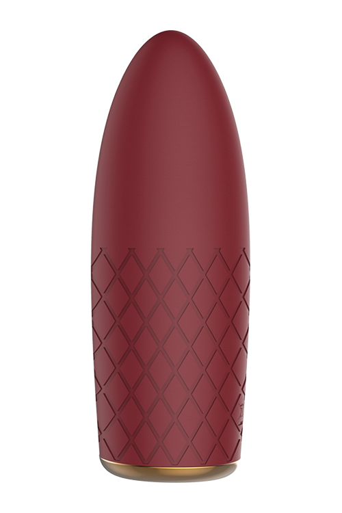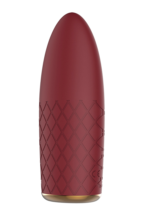 Kieszonkowy wibrator Marly w kolorze bordowej czerwieni ma strukturę w kształcie rombu z miękkiego silikonu spożywczego u podstawy i gładką górną część z elastyczną końcówką