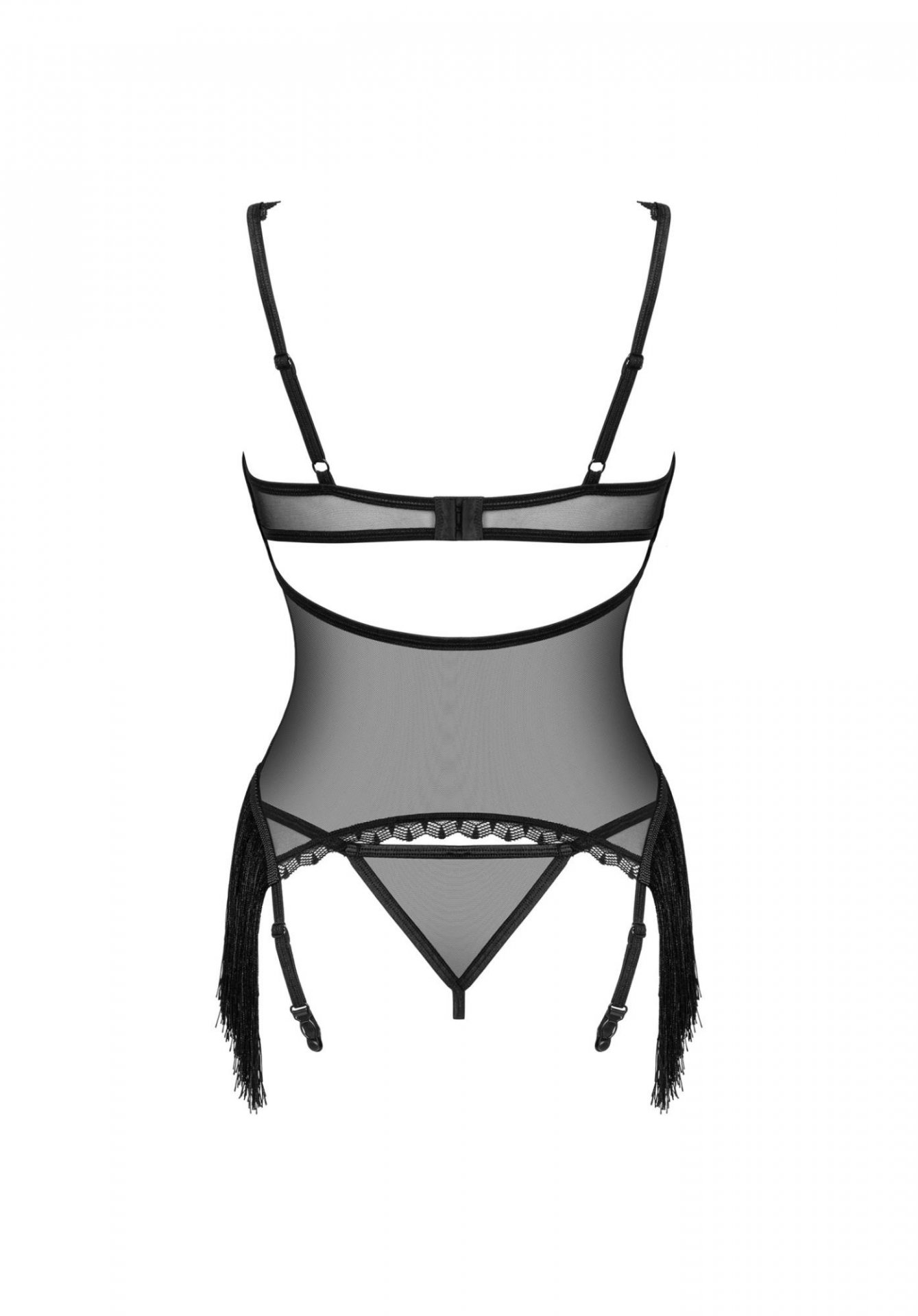 Poznaj więcej szczegółów:- czarny gorset i stringi – idealne dopasowanie dzięki regulowanym ramiączkom i paskom do pończoch- niebanalne detale – przyciągną uwagę- transparenty, miły w dotyku materiał (90% poliamid, 10% elastan)