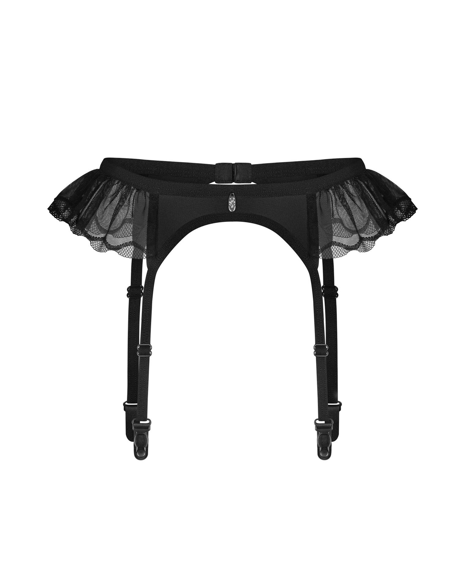 Tiulowa falbanka dodaje lekkości, a głęboka czerń podkreśla wyrafinowany charakter bielizny. Regulowane paski umożliwiają idealne dopasowanie pończoch, zapewniając wygodę i stabilność. Z tyłu znajduje się kilkustopniowe zapięcie, które pozwala na precyzyjne dopasowanie do sylwetki.