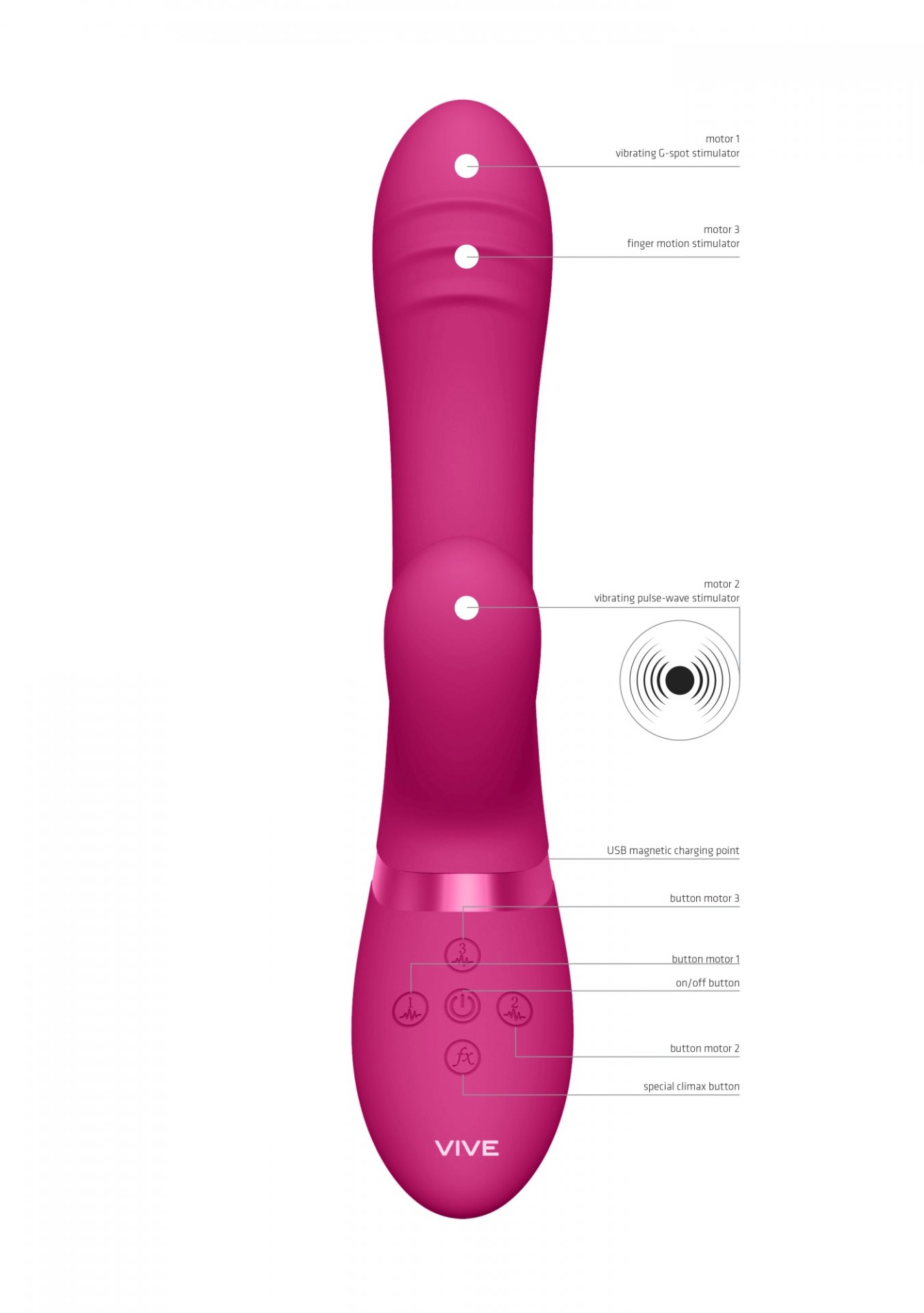Jeden 10-funkcyjny wibrujący silnik NG F1 do stymulacji punktu G, jeden innowacyjny 10-funkcyjny silnik NG F1 zapewniający ruch naśladujący ruch palca oraz jeden innowacyjny, 10-funcyjny silnik wytwarzający pulsującą falę do stymulacji łechtaczki
